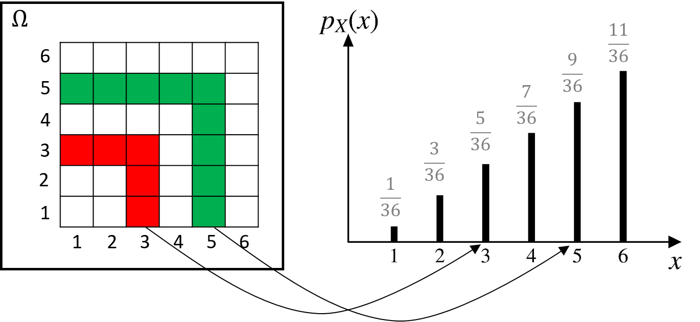 \[ \begin{aligned} p_X(x) =& \; \text{P}(X=x) \\ =& \; \text{P}(\text{all outcomes in $\Omega$ that give rise to $X=x$}) \\ \text{for all $x$.}& \\ \end{aligned} \]